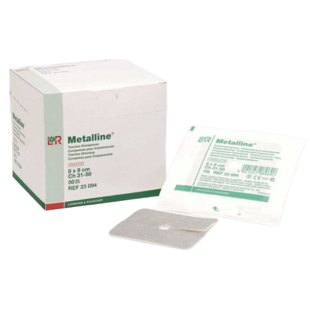 Apósito traqueotomía Metalline 8 cm x 9 cm – Caja de 50 unidades. Compresa estéril no adherente, ideal para traqueotomías y drenajes. Su diseño con aluminio perforado y capa absorbente permite un cuidado suave, seguro y sin dolor.