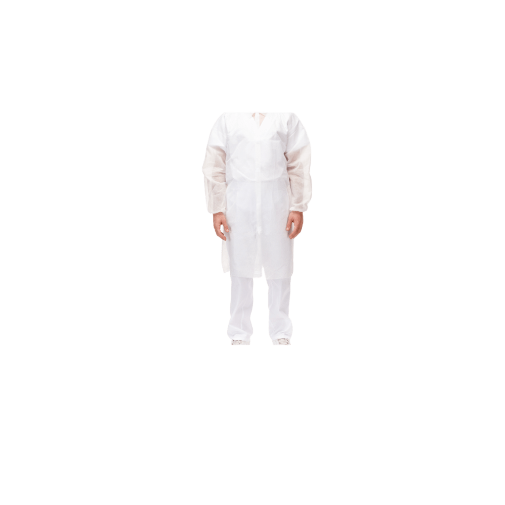 Bata de protección fabricada en polipropileno de 35 g/m², con medidas de 112x138 cm. Cuenta con cuello tipo camisa, cierre mediante 5 velcros y mangas largas con elásticos que garantizan un ajuste cómodo y seguro. Es un producto de un solo uso, diseñado para protección frente a riesgos menores. Debe almacenarse en su embalaje original, en un lugar seco, protegido de la luz solar y a temperaturas entre –2ºC y +50ºC (recomendado entre +5ºC y +30ºC).