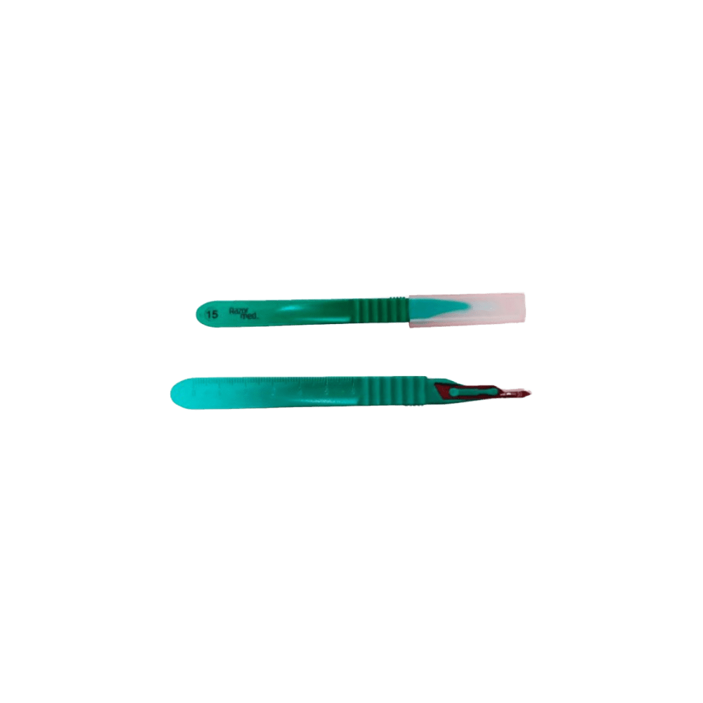 Bisturí estéril RAZORMED – Caja de 10 unidades. Bisturí desechable estéril con mango, hoja y capucha protectora, disponible en varios tamaños de hoja para adaptarse a diferentes intervenciones y procedimientos médicos.