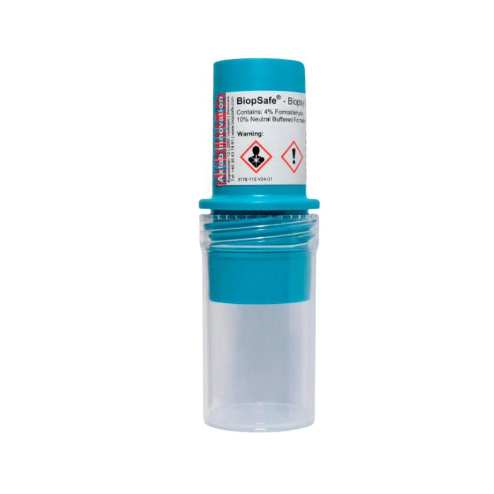 Contenedor Biopsafe – Seguridad total en el transporte de biopsias Recipiente hermético de 20 ml que aísla completamente el formol. Conserva tejidos biopsiados de forma segura hasta su análisis médico.