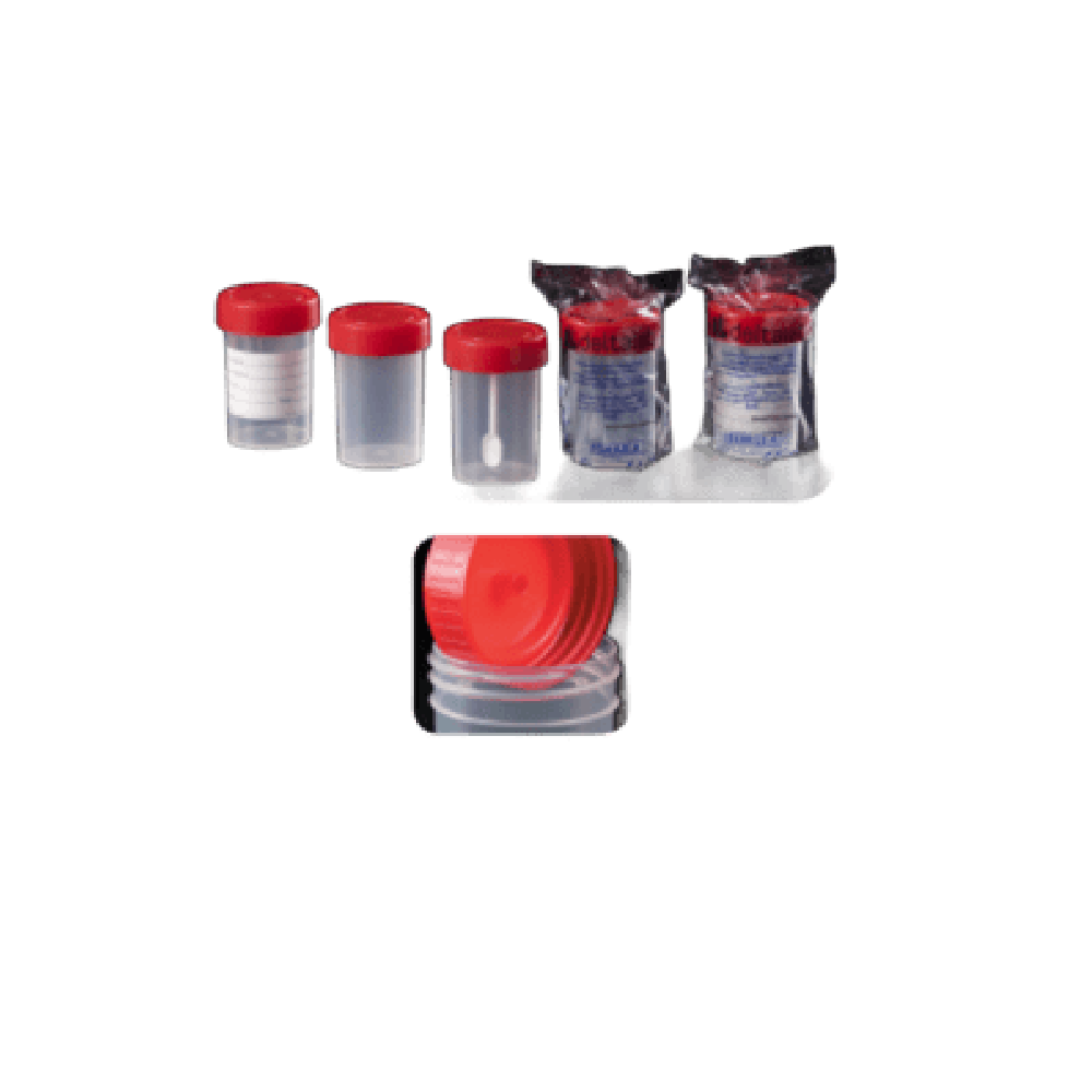 Colector de orina de 60 ml para diagnóstico in vitro, fabricado en polipropileno y tapa de polietileno de alta densidad. Cuenta con boca ancha, paredes transparentes, cierre estanco mediante tapa a rosca roja. Presentado en bolsa unitaria termosellada, garantiza asepsia y seguridad en la recolección de muestras clínicas