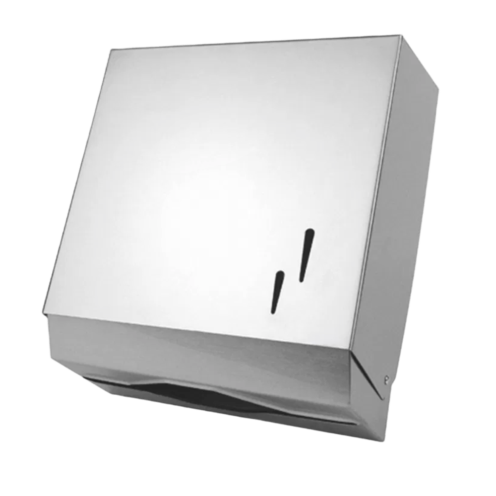 Dispensador Toallero Satinado – Elegancia, resistencia y funcionalidad para espacios sanitarios Dispensador de toallas fabricado en acero noble satinado 430, con capacidad para 600 toallas. Cierre metálico con llave