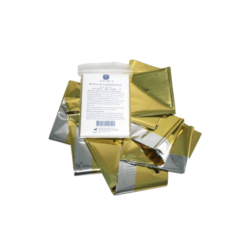 La manta de emergencia termoaislante está diseñada para conservar eficazmente el calor del cuerpo, reteniendo hasta un 80% de la temperatura generada por la persona que la utiliza. Este tipo de manta es especialmente útil en situaciones de emergencia o rescate donde es fundamental evitar la pérdida de calor corporal y prevenir el enfriamiento, lo cual puede ser peligroso para la salud. Gracias a su diseño y materiales específicos, proporciona una barrera térmica que ayuda a mantener la temperatura del usuario en ambientes adversos o fríos. Además, cada manta viene empaquetada de forma individual para asegurar su higiene y facilidad de transporte. Este producto es completamente libre de látex, lo que lo hace seguro para personas con alergias a este material. Instrucciones de uso de la manta termoaislante UNIDIX • Consulte las indicaciones detalladas en el embalaje individual antes de usar. Ventajas • Puede conservar hasta el 80% del calor corporal, prolongando la retención de temperatura por más tiempo. • La superficie plateada y brillante refleja la luz, protegiendo contra la radiación solar. • La persona cubierta con esta manta es más visible desde grandes distancias, facilitando su localización. • Es adecuada para su uso en entornos médicos, hospitales, quirófanos, situaciones de emergencia y también para actividades de riesgo en el ámbito personal. • Su tamaño abierto es suficiente para cubrir a un adulto de estatura media o a un niño, gracias a su material flexible que se adapta fácilmente al cuerpo. • Empaquetada de forma compacta, es ideal para llevar en botiquines, mochilas o para transporte sencillo. .