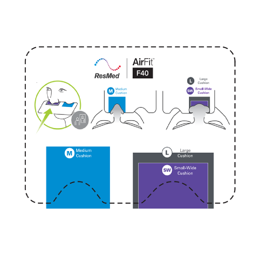 Mascarilla CPAP modelo ResMed AirFit F20 talla L, diseñada para terapia respiratoria no invasiva. Destaca por su ergonomía, mejor adaptación al rostro y ausencia de soporte frontal, lo que reduce la incomodidad y mejora la experiencia del paciente.