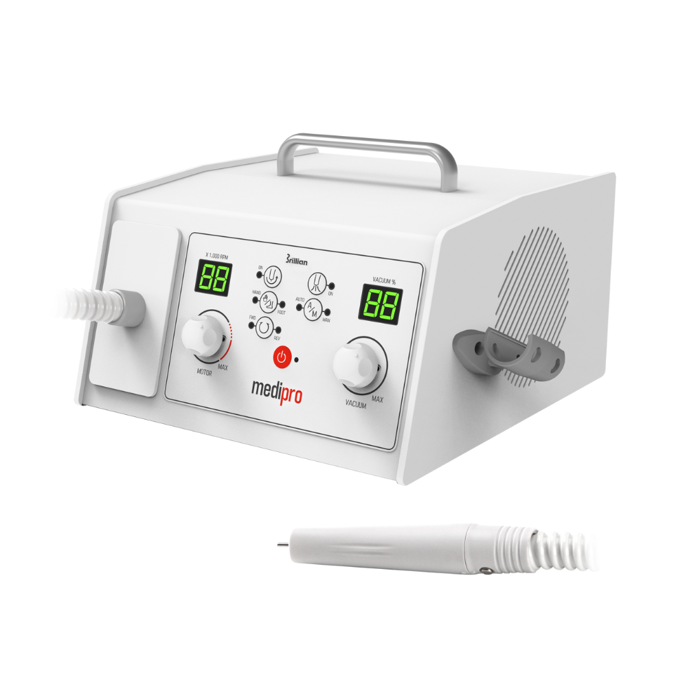 Motor sin escobillas (inducción): La principal característica de este modelo es la ausencia de escobillas, lo que resulta en un funcionamiento más silencioso, menor vibración y una vida útil más prolongada del motor. Velocidad: Alcanza una velocidad máxima de 40.000 revoluciones por minuto (rpm), con la posibilidad de girar en ambos sentidos (horario y antihorario). Potencia: Proporciona 120W de potencia para el giro y un torque de 5 Ncm, lo que garantiza una alta precisión y potencia incluso a bajas velocidades. Sistema de aspiración integrado: Incluye un motor de aspiración sin escobillas, que permite capturar el polvo generado durante el tratamiento, manteniendo el área de trabajo limpia y estéril. El nivel de aspiración es regulable digitalmente. Pieza de mano: Es más ligera y ergonómica que los modelos anteriores de la marca. Además, la pieza de mano incorpora un interruptor y una luz. Panel de control digital: Permite visualizar y controlar de manera precisa la velocidad de rotación y el nivel de succión. Algunos modelos, como el MediPro Touch, cuentan con una interfaz táctil. Funciones adicionales: Pedal de control (ON/OFF): Incluido para una operación manos libres. Cambio de bolsa de aspiración: Sencillo y rápido. Ventajas sobre modelos anteriores: Es una versión mejorada del Medipower, con menos vibración, menos ruido y una pieza de mano más ligera. Aplicaciones Gracias a su precisión, potencia y control, el micromotor Medi PRO es ideal para tratamientos que requieren un trabajo minucioso en: Podología Manicura y pedicura Estética Laboratorios dentales