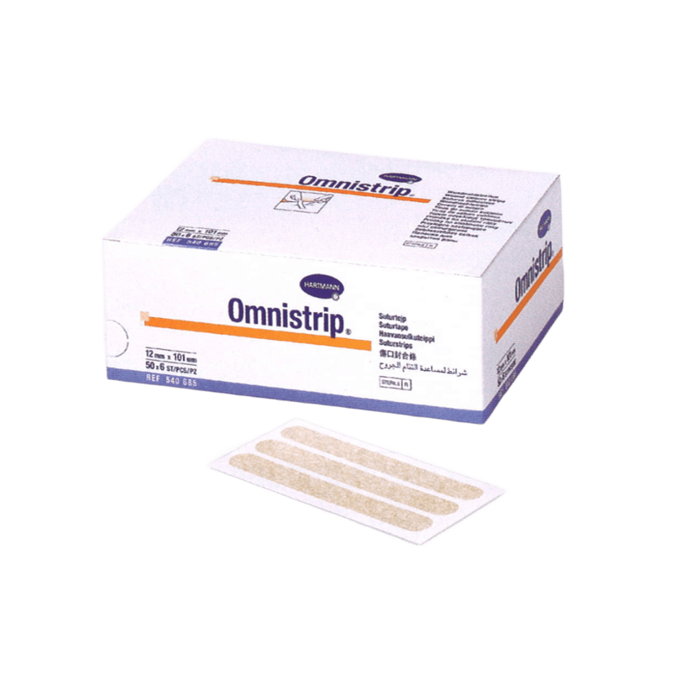 Tira de Sutura Cutánea Omnistrip – Adhesiva, estéril y transpirable Tira adhesiva de tejido no tejido (TNT) color piel. Alta conformabilidad, transpirabilidad y adhesión. Indicada para cierre de heridas superficiales.