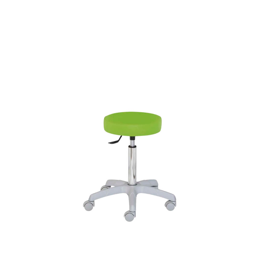 Taburete giratorio bajo 5 ruedas – Asiento cómodo, resistente y de altura regulable Regulable en altura mediante cilindro de gas cromado, asiento acolchado en polipiel ignífuga y base estable con cinco ruedas giratorias. Ideal para uso profesional.